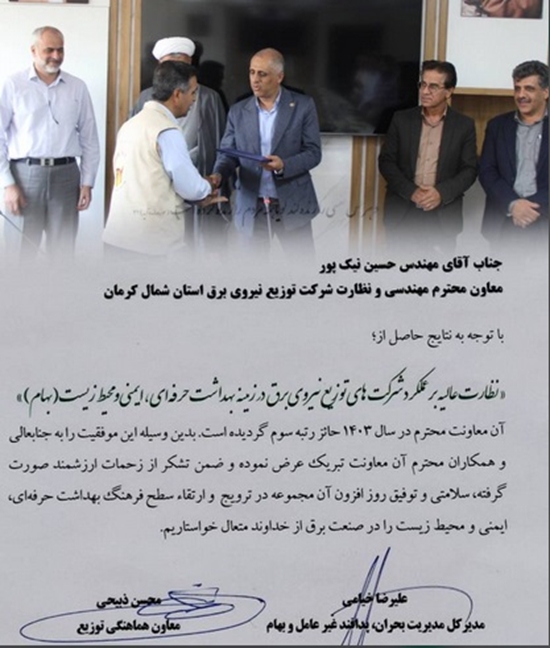 بدین وسیله این موفقیت را به جنابعالی و همکاران محترم آن معاونت تبریک عرض نموده و ضمن تشکر از زحمات ارزشمند صورت گرفته، سلامتی و توفیق روزافزون آن مجموعه در ترویج و ارتقای سطح فرهنگ بهداشت حرفهای، ایمنی و محیط زیست را در صنعت برق از خداوند متعال مسئلت داریم.